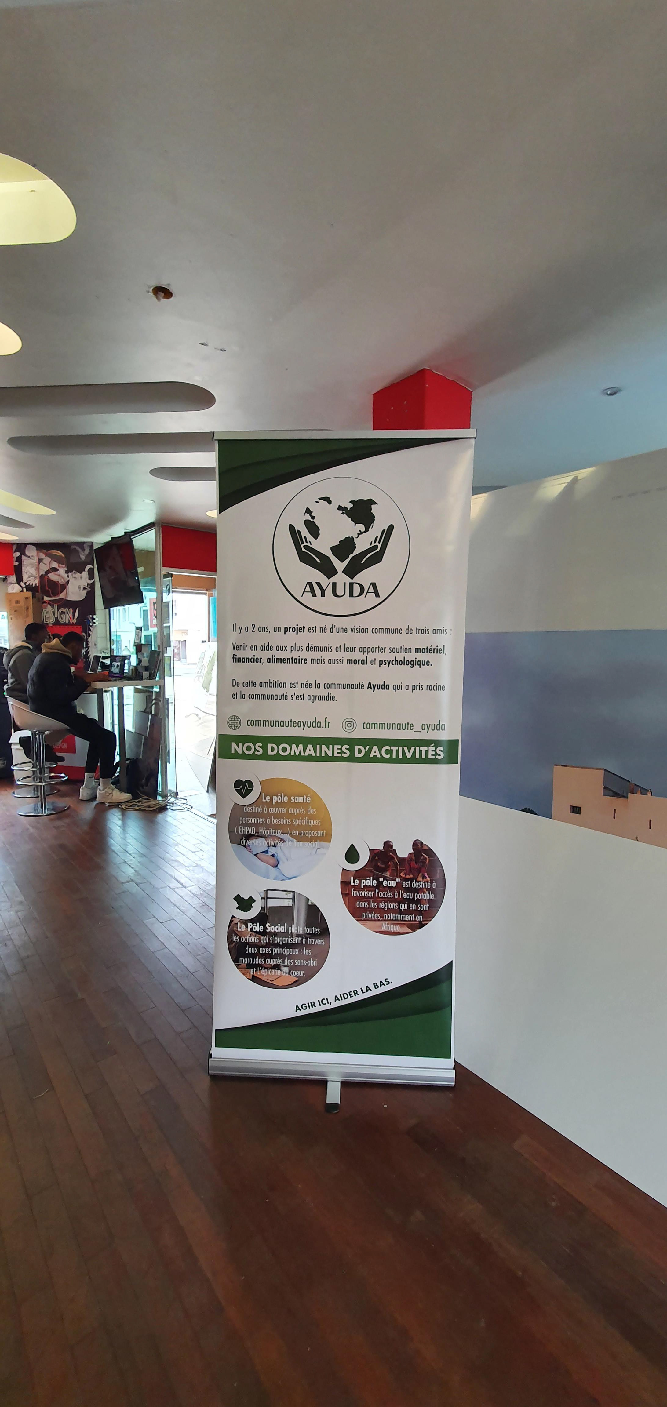 La demande du client pour le projet "Ayuda" était de produire un Roll-Up pour une exposition. Les textes et images ont été fournies par le client